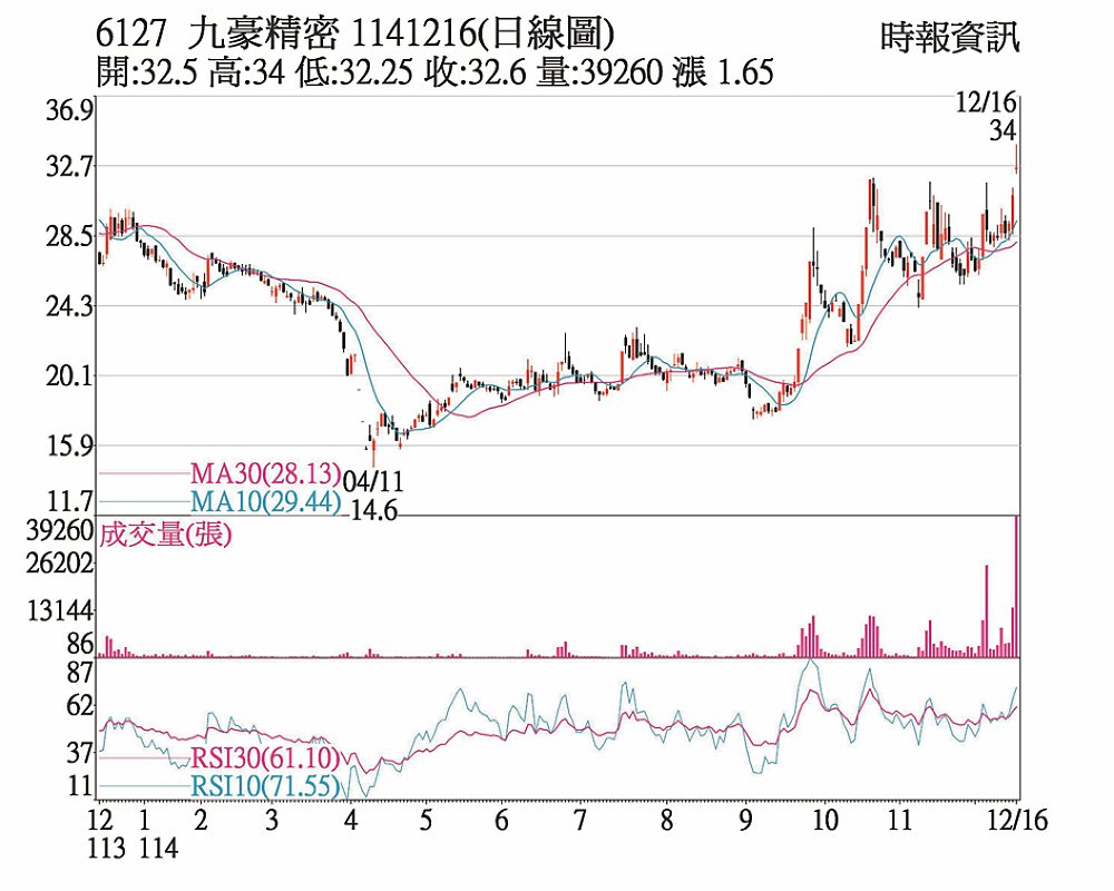 九豪(6127)度過遷廠陣痛期,2026年東莞新廠挑戰八條生產線全稼動,並期盼步入滿載階段,稼動率到位加上高自動化,明年毛利率可望回復至過去水準。九豪16日股價挾營運利多,帶量大漲,盤中觸及漲停板價位,終場漲幅雖收斂,仍大漲逾半根漲停,成為少見的逆勢抗跌股,目前KD仍維持多頭。