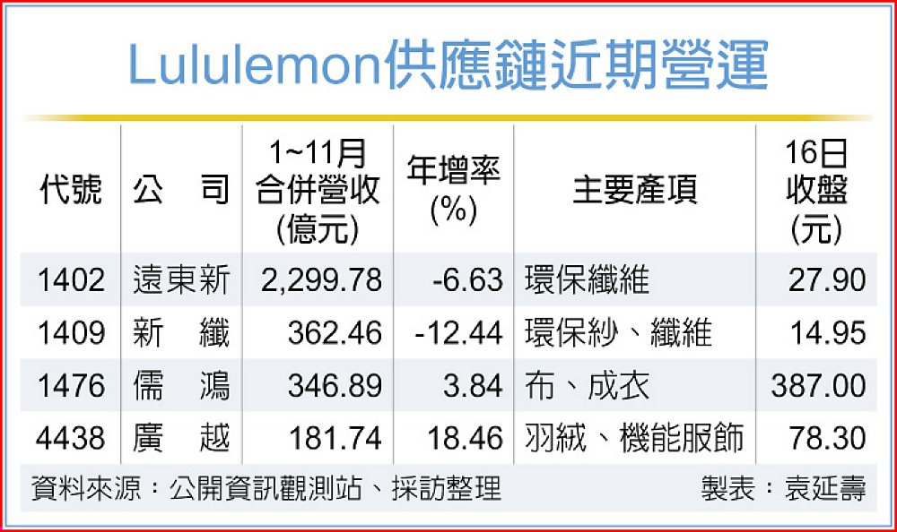 根據最新公布的資料,以瑜珈服聞名的加拿大運動品牌Lululemon,第三季財報優於市場預期,國內相關供應鏈將可受惠。儒鴻(1476)為Lululemon面料與成衣供應商之一,聚陽(1477)則替Lululemon成衣代工,遠東新(1402)提供Lululemon環保再生纖維,新纖(1409)是供應鏈Tier 2面料供應商之一。
