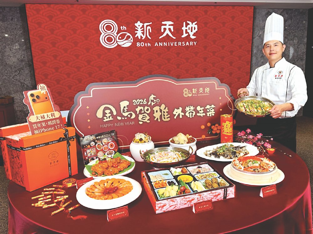 新天地16日發表2026馬年外帶年菜專案《金馬賀雅》,主打「除夕現做、熱食即食」的常溫年菜,其中「雅饌團圓六福宴」售價8,888元、「豐歲雅饌十全宴」售價12,888元。新天地去年外帶年菜銷售量達1,400套,今年銷售目標提高到1,500套,預估可創造2,000萬元的業績。