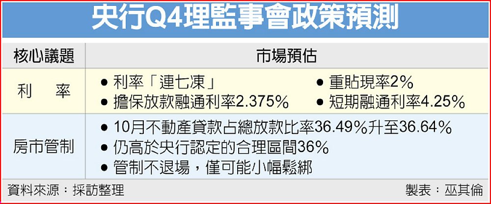 中央銀行18日召開第四季理監事聯席會議,外界關注央行利率政策基調,及靜待最新的今、明年經濟成長率及消費者物價指數(CPI)預測。市場預期,國內通膨可控、經濟成長優於預期,央行並沒有降息空間,政策利率將「連七凍」,尤其房市信用管制剛顯效,還不到退場的時候。
