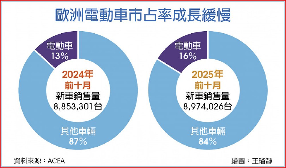 非營利組織「氣候組織」運輸部門主管芬恩沉痛地表示,這是場傳統產業對電動車的「悲劇性勝利」,歐盟放緩汽油與柴油引擎的淘汰計畫,等於打臉歐洲投資數十億歐元發展電動車隊並迫切需要政策穩定的企業。券商傑富瑞分析,全球汽車產業進入重整時刻,而非筆直走向全面電動化。歐洲汽車製造商協會統計,前10月歐洲新車銷售量約897.4萬台,電動車僅占16%。