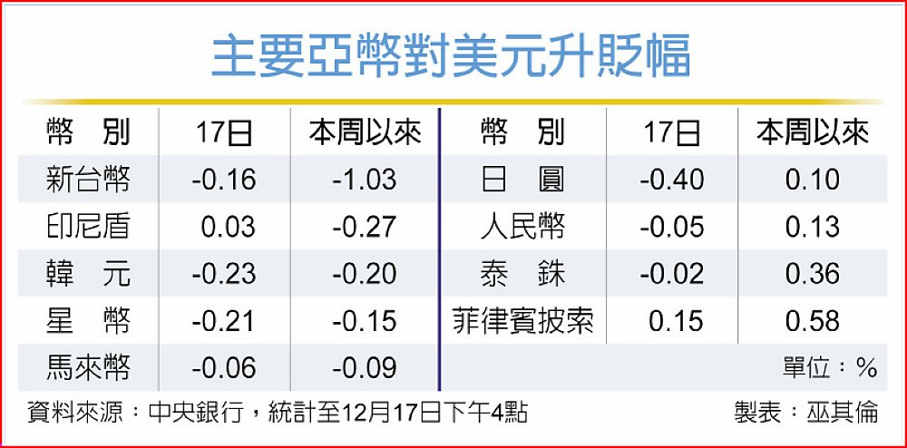 亞幣本周升貶互見,新台幣大跌1.03%最弱、印尼盾貶0.27%、持續疲弱的韓元下跌0.2%,星幣跌0.15%,馬來幣貶0.09%;日圓反應升息預期小升0.1%、人民幣上揚0.13%。