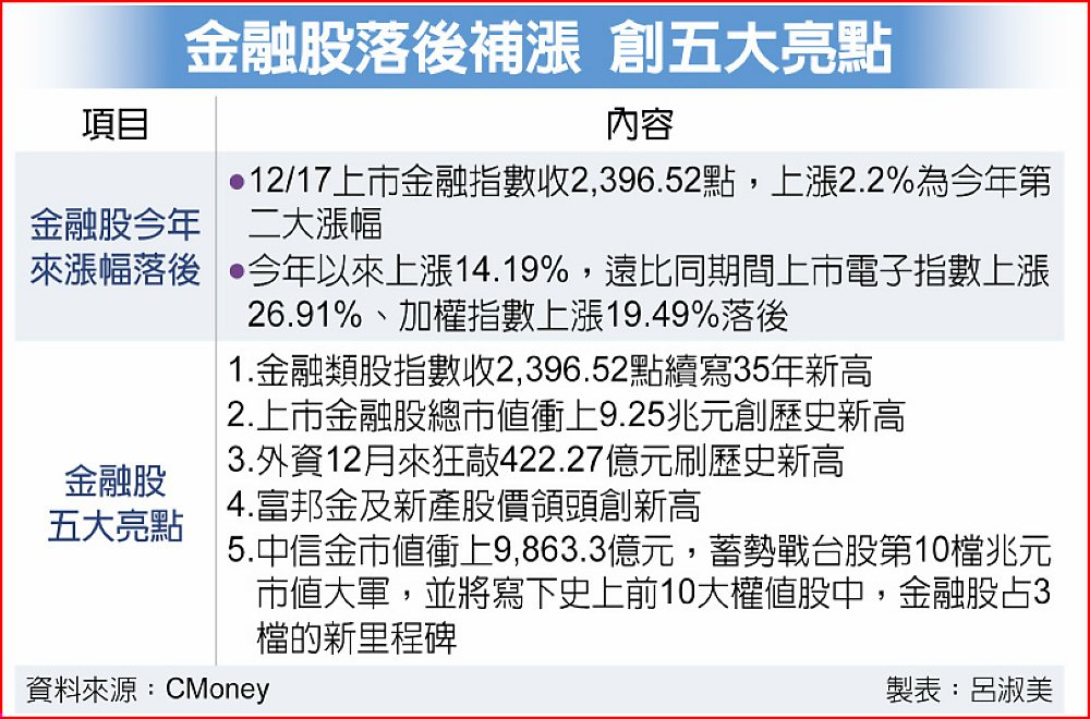 金融股17日表現亮眼並寫下五大亮點:一、上市金融指數收2,396.52點續寫35年新高;二、總市值衝上9.25兆元創歷史新高;三、外資12月來狂敲422.27億元刷歷史單月新高;四、富邦金及新產股價領頭創上市來新高;五、中信金市值衝上9,863.3億元,蓄勢戰台股第十檔兆元市值大軍,並將寫下史上前十大權值股中,金融股占三檔的新里程碑。
