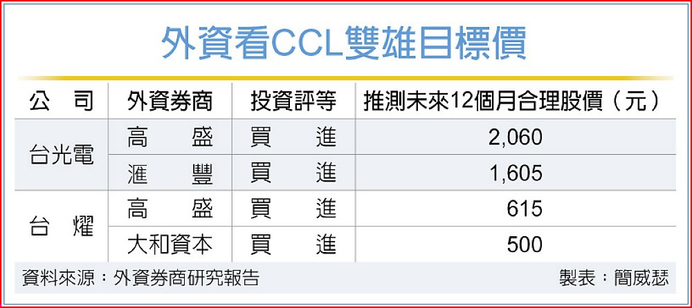 觀察台光電、台燿的M6與以下等級CCL第四季的營收占比,高盛估計,台光電約35%~45%、台燿則達50%~60%以上。隨相關產品價格上調,研判CCL雙雄本季營收相較上季可望出現約3%~6%以上的上行空間,且未來幾個季度仍可能再貢獻約3%~6%的營收增幅。不僅如此,搭配供需結構轉趨有利,高盛認為,台光電、台燿未來幾季的獲利能力可望明顯改善,因此,將雙雄股價預期分別上調至2,060元與615元,均為外資最高。