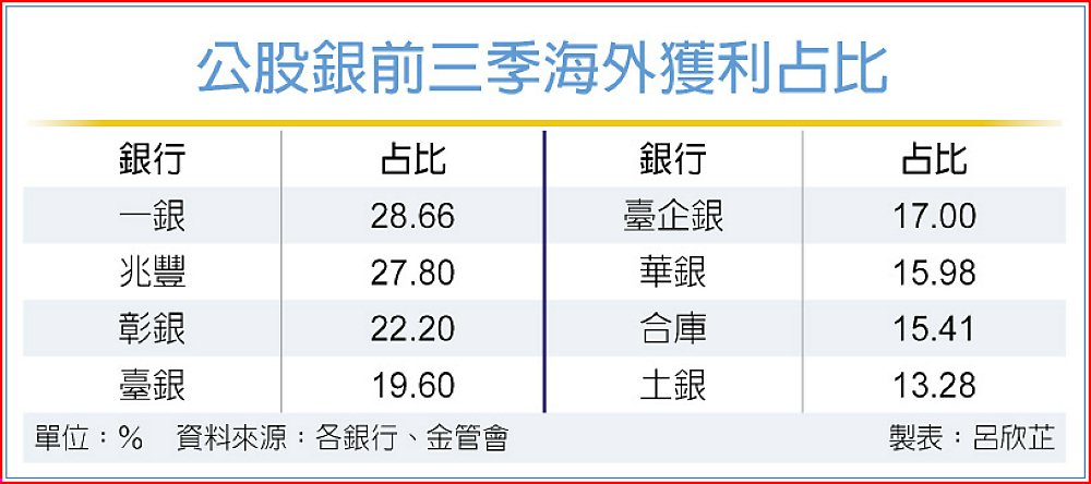 臺灣銀行、臺灣企銀、華南銀行、合庫銀行及土地銀行前三季海外獲利占比介於13%~20%之間。合庫銀主管說明,前三季海外獲利30.31億元,較去年同期大幅增加2倍,主因大額備抵呆帳費用減少所致,未來將掌握台商分區布局趨勢,聚焦於重要金融中心,日本東京分行已正式營運,目前正積極推進新加坡分行籌設進度,力拚實現全球布局、區域管理、在地扎根的經營方針。