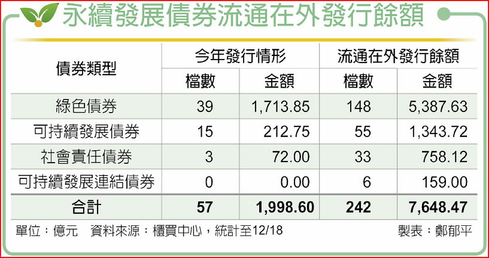 櫃買中心17日表示,回顧今年,櫃買永續發展債券推動效果顯著,統計今年來截至18日,永續發展債券累計發行檔數已達57檔,發行金額衝上1,998.6億元,若再加計高雄市政府、遠東新19日將分別發行的76億、16億元綠色債券,全年發行金額將正式突破2,000億元大關、達2,090.6億元,再刷歷史新高紀錄,且發行金額更是在連四年突破千億元後,第五年直接躍上2,000億元新里程碑。