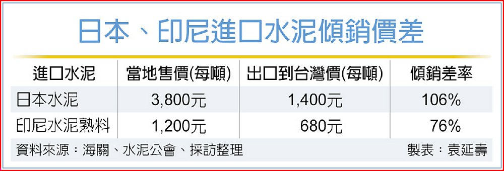 根據財政部海關進口報價及當地國內銷售價數據,來自越南、印尼、日本等國的進口水泥,超低出口售價顯示明顯的惡意傾銷行為;以2024年下半年至2025年上半年為比較區間,日本水泥在日本國內的正常售價為每噸3,800元,而出口到台灣的價格卻僅1,400元,傾銷差率高達106%;來自印尼的水泥熟料,在印尼國內的正常售價為每噸1,200元,但出口到台灣的價格僅680元。