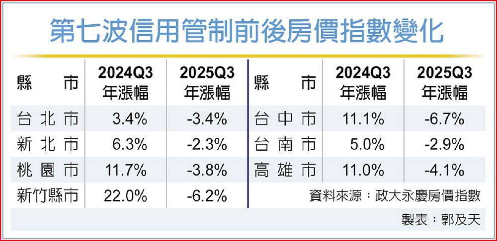 中央銀行第七波選擇性信用管制上路一年多來,房價全面修正。根據政大永慶房價指數,今年第三季七都大樓房價指數較去年同期下跌2.3%~6.7%,其中雙北公寓跌幅更深,台北、新北分別下跌10.1%、8.2%,跌回四年前水準,反映過去一年房貸緊縮、信用管制及市場預期轉變影響下,房市明顯降溫。