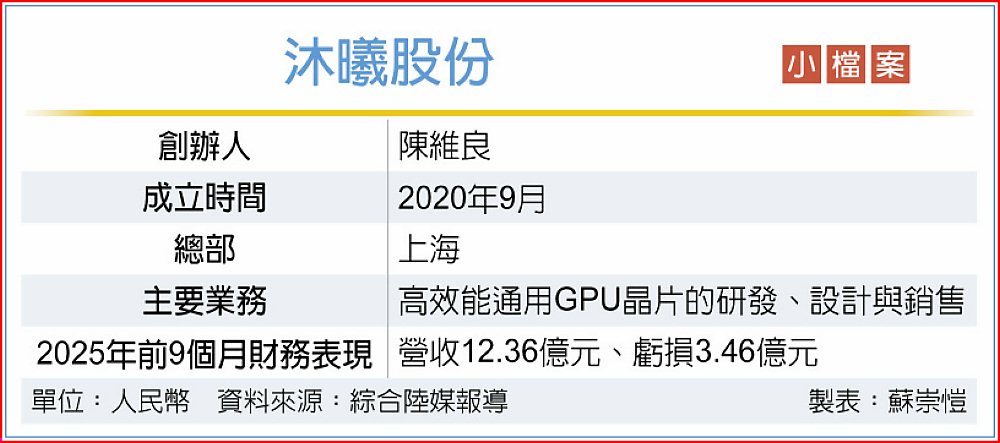 華爾街日報報導,儘管沐曦尚未獲利,但受惠於科創板對戰略性產業的寬鬆上市規則,只要預估市值與技術潛力達標即可掛牌。財報顯示,該公司2025年前三季營收為12.36億元,年增453%,但虧損仍達3.46億元。