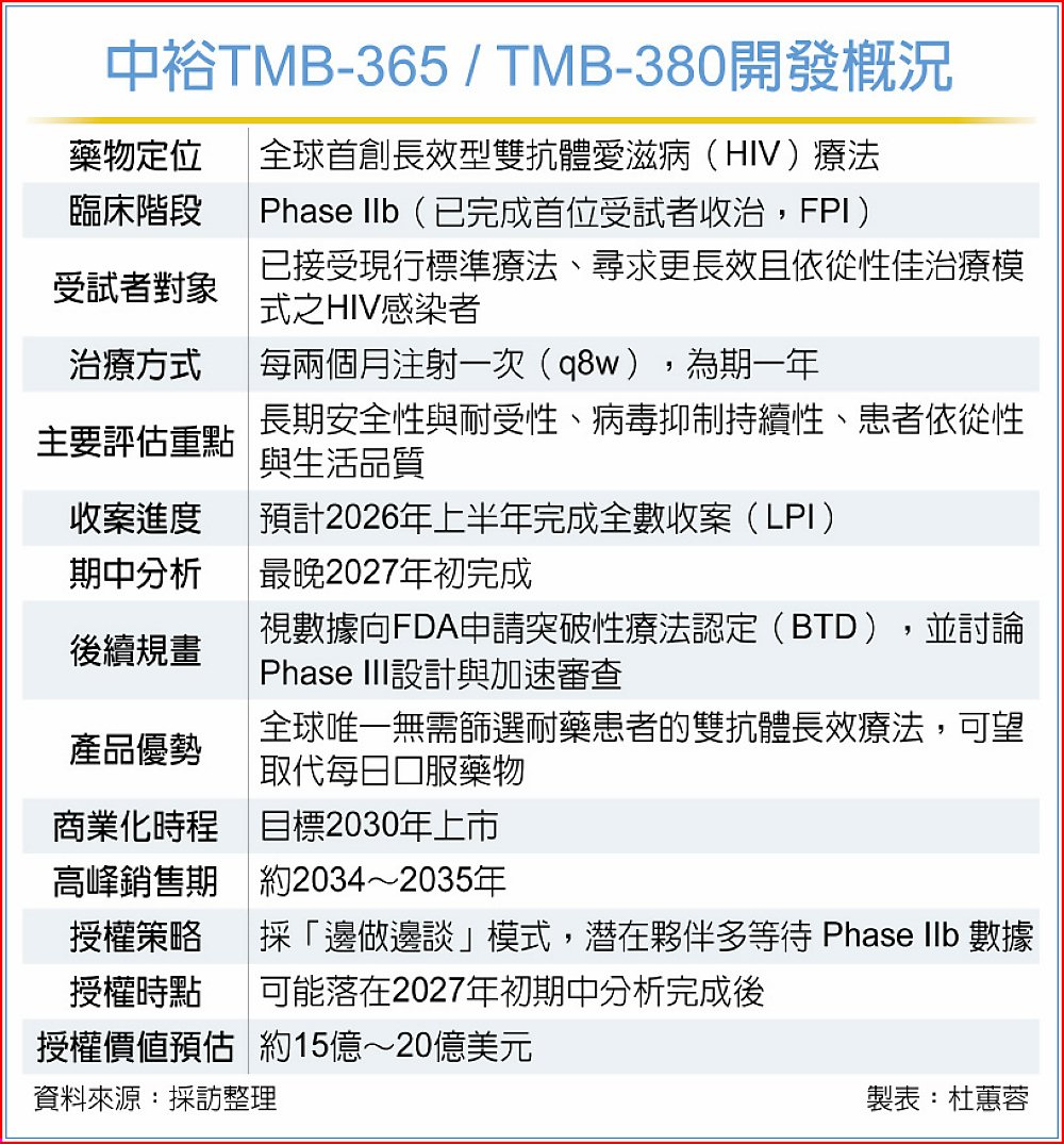 中裕執行長張金明表示,TMB-365/TMB-380目標於2030年上市,高峰銷售期落在2034至2035年,年藥費將訂於5萬至6萬美元,與現行主流口服愛滋藥物水準相當。產品將鎖定全球長效HIV治療市場,定位為成長期療法。依同類藥物市場估值推算,法人看好授權價值可望達15億至20億美元。