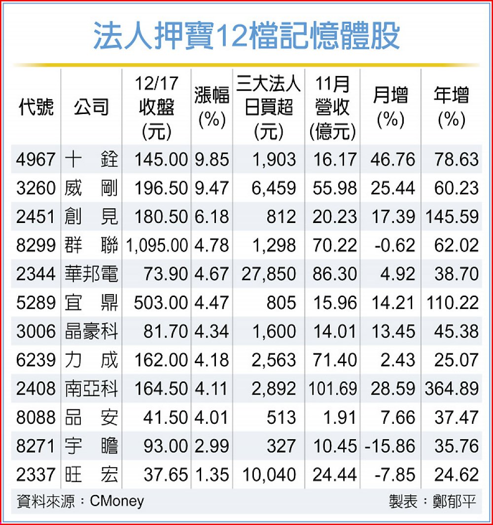 關注法人操作動向,三大法人普遍在財報公布前夕進場布局,押寶心態濃厚。其中,指標股華邦電、旺宏分別獲三大法人單日進場加碼2.79萬張及1萬張,威剛也有6,459張買盤支援,另力成、南亞科、群聯、十銓等也有單日逾千張買盤全力援護,市場看好其基本面亮眼,股價仍有持續成長動能。