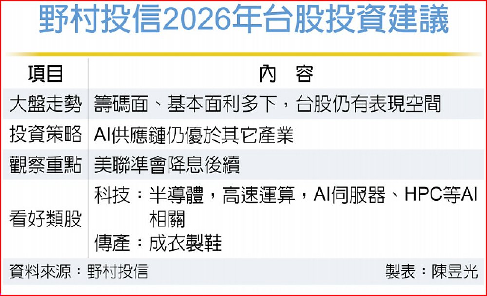 台股進入年底倒數僅剩不到10個交易日,展望2026年,野村投信國內股票投資部主管姚郁如指出,AI資本支出與CSP長約綁定降低「僅靠敘事」的風險,基本面支撐仍強。2026年台股將呈現「景氣溫和回升+AI長期資本支出驅動+傳產補庫與事件拉抬」三重奏,預估2026年台股獲利成長仍有21%,支撐台股評價。