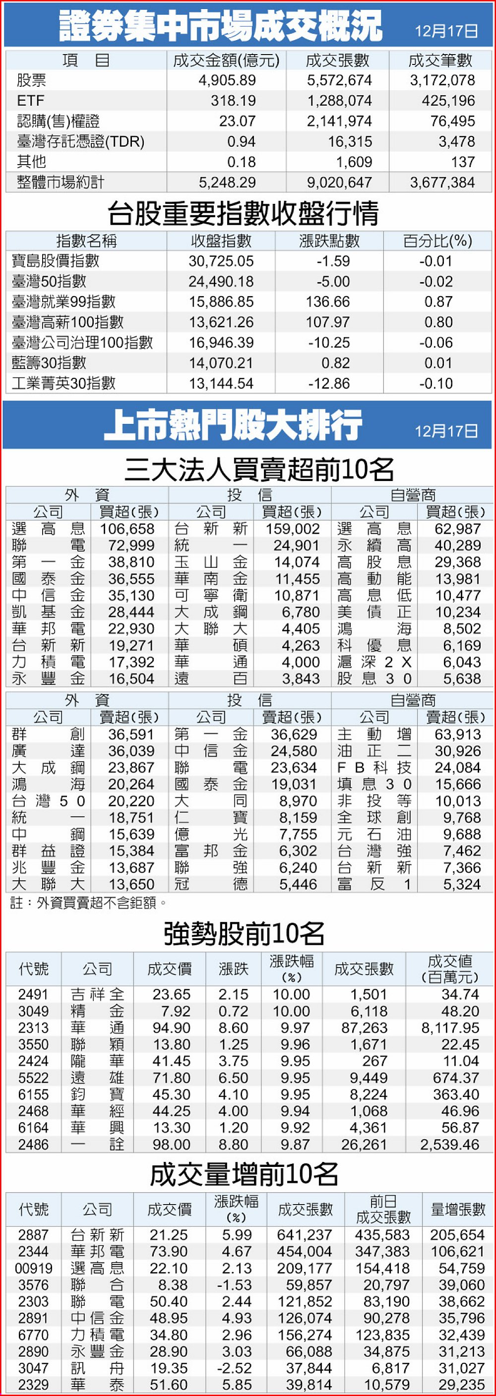 證券集中市場成交概況、上市熱門股大排行