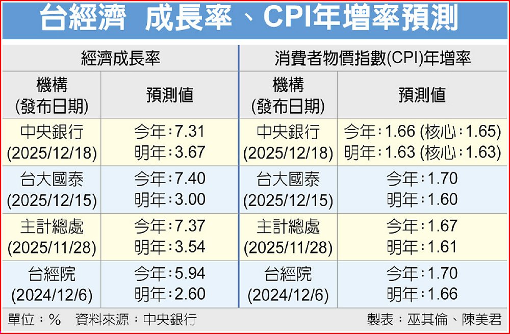 年末超級央行周落幕前,中央銀行18日舉行第四季理監事會議,一如預期利率「連七凍」,重貼現率停在2%。其中最受矚目的是,央行大幅上修今、明年經濟成長率預測至7.31%、3.67%。今年經濟成長率將創下15年新高,明年則創下各機構最樂觀預測。央行總裁楊金龍表示,因AI超出預期,我國經濟成長率確實很特殊,應該是「非常態」表現。