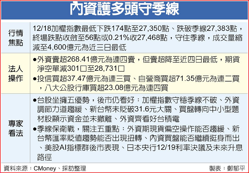 內資持續「錢進台股」,投信、自營商分別加碼37.47億元、71.35億元,為連三買及連二買,加上八大公股行庫也買超23.08億元為連四買,外資將放假提款不手軟,內資銀彈大力支援護台股,力守季線不破。