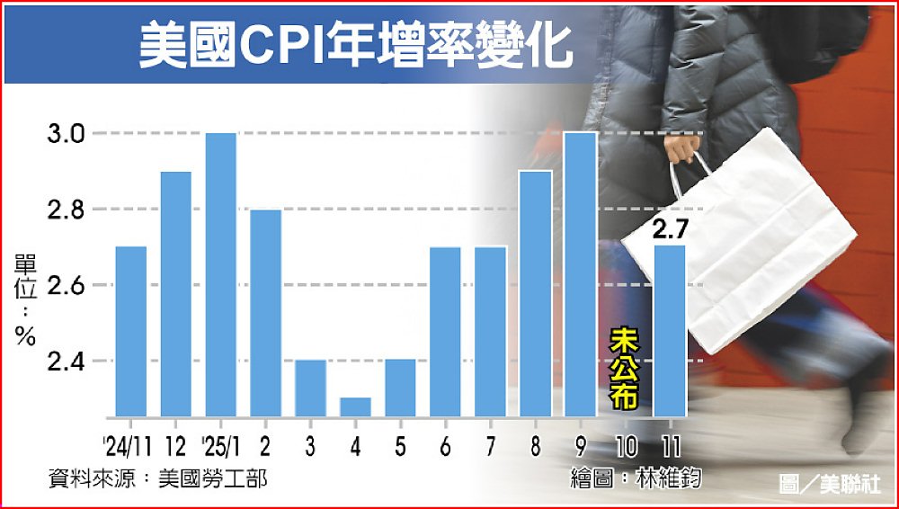 美國11月消費者物價指數(CPI)年增率從9月的3%降至2.7%,創今年7月以來最低,核心年增降至2.6%低於預期,令市場重燃對通膨降溫與美國聯準會(Fed)未來降息的期待。受政府關門影響,11月CPI月增率與10月數據未公布。