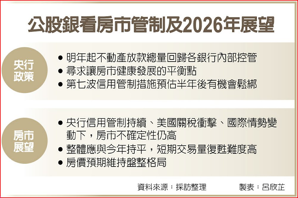 對2026年房市展望,公股銀認為,整體房市表現應會與今年持平,由於央行信用管制持續、美國關稅衝擊、國際情勢變動,房市不確定性仍高,當前交易量能復甦難度高,國內房市將持續修正,預估是「量縮、價盤整」格局,房貸業務也將僅低度成長。