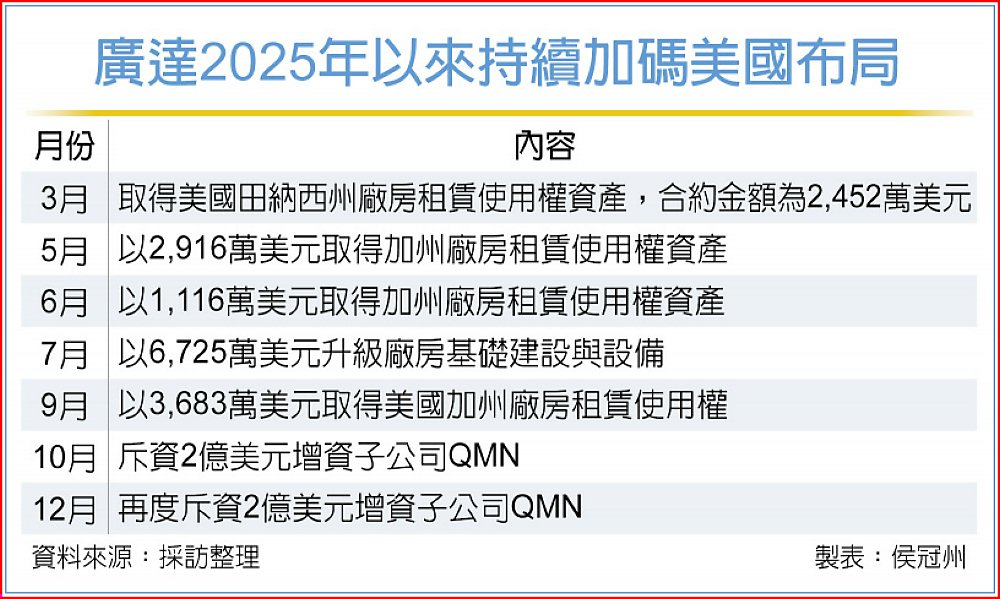 廣達今年以來已經多次公告投資美國,先是3月時公告取得美國田納西州廠房租賃使用權,金額2,452萬美元;5、6月時公告以2,916萬美元、1,116萬美元取得加州廠房租賃使用權,7月以6,725萬美元升級廠房基礎建設與設備,9月以3,683萬美元取得美國加州廠房租賃使用權。10月斥資2億美元增資子公司QMN,12月時再度公告投入2億美元增資QMN。