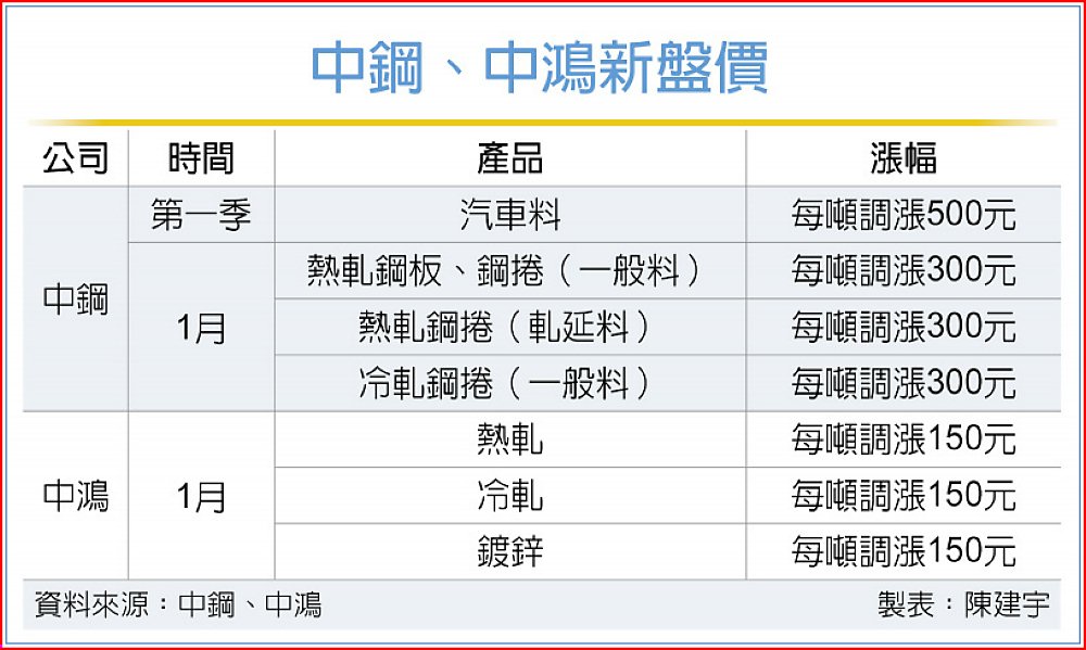 中鋼18日開出2026年1月及第一季盤價,月盤部分熱、冷軋每噸都漲300元,季盤則是汽車料每噸漲500元,而同日開盤的中鴻明年1月熱、冷軋及鍍鋅每噸都漲150元。