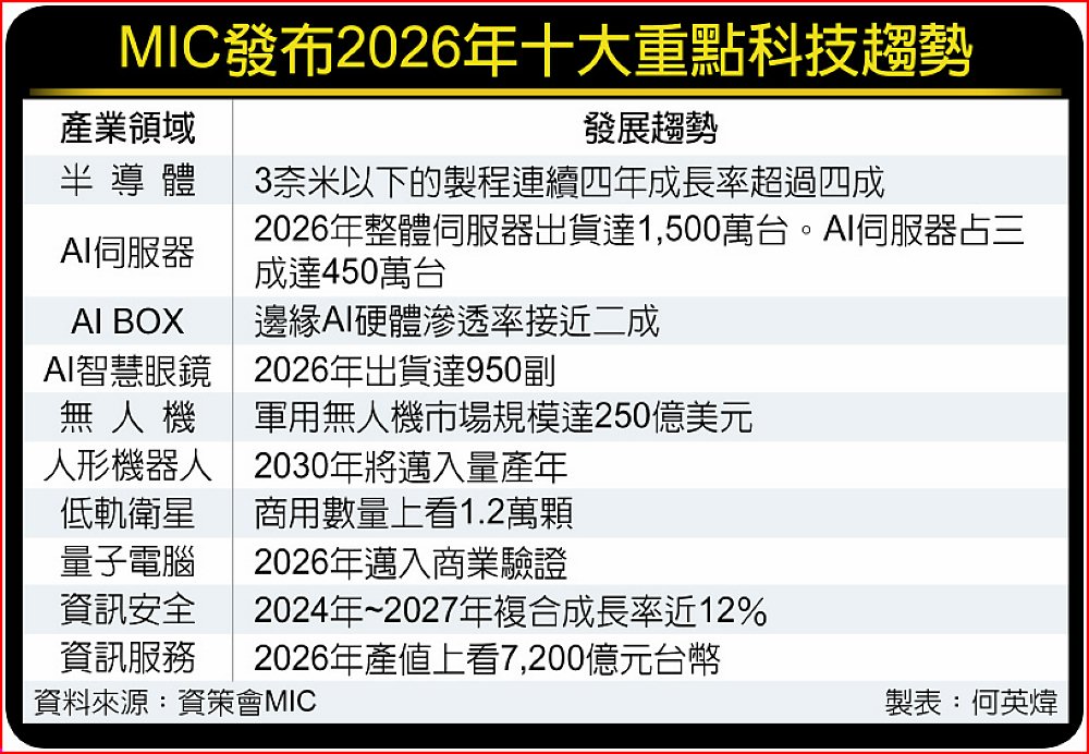 資策會產業情報研究所(MIC)18日發布「2026年十大重點科技趨勢」,認為生成式AI與大型模型快速發展帶動下,2026年全球科技產業正全面推動半導體與資通訊產業結構重組。