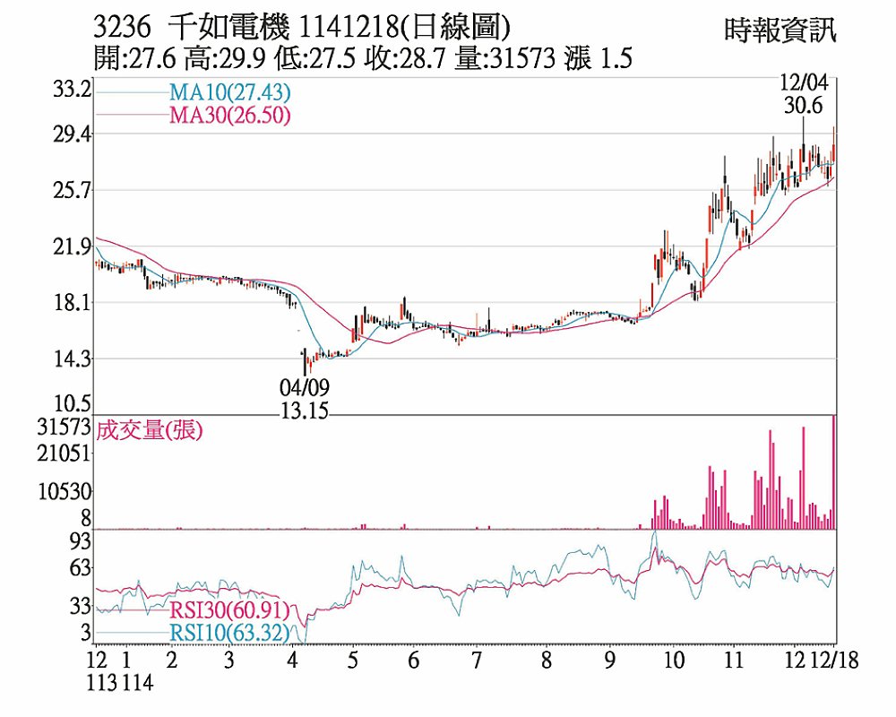 千如(3236)股價位階相對仍低,加上整體電感族群籠罩漲價題材利多,千如18日不懼台股下跌,逆勢大漲逾半根漲停板,成交量3.14萬張,創下近期最大量能,日K帶量拉出長紅K棒,目前KD呈現低檔交叉向上,短線仍有利於多頭。