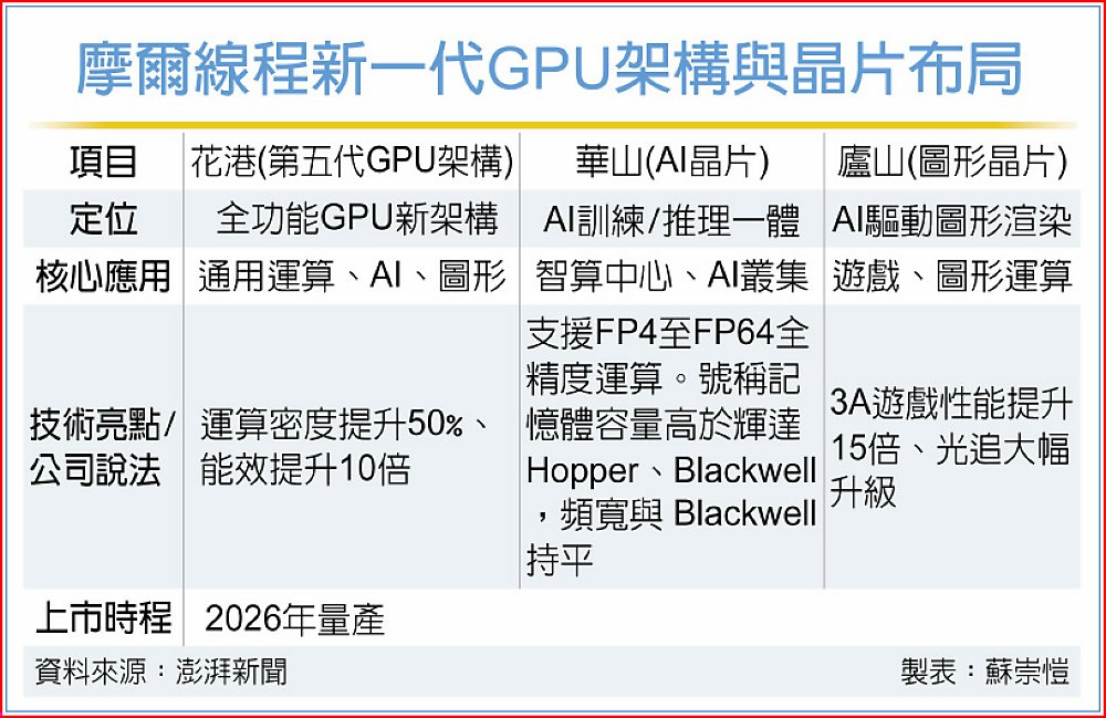 中國GPU大廠摩爾線程20日發表全新GPU架構「花港」,並推出專為AI訓練設計的「華山」晶片。該公司宣稱,新一代產品在記憶體存取容量等關鍵指標上,已超越輝達目前的Blackwell架構,力拚在2026年量產上市。
