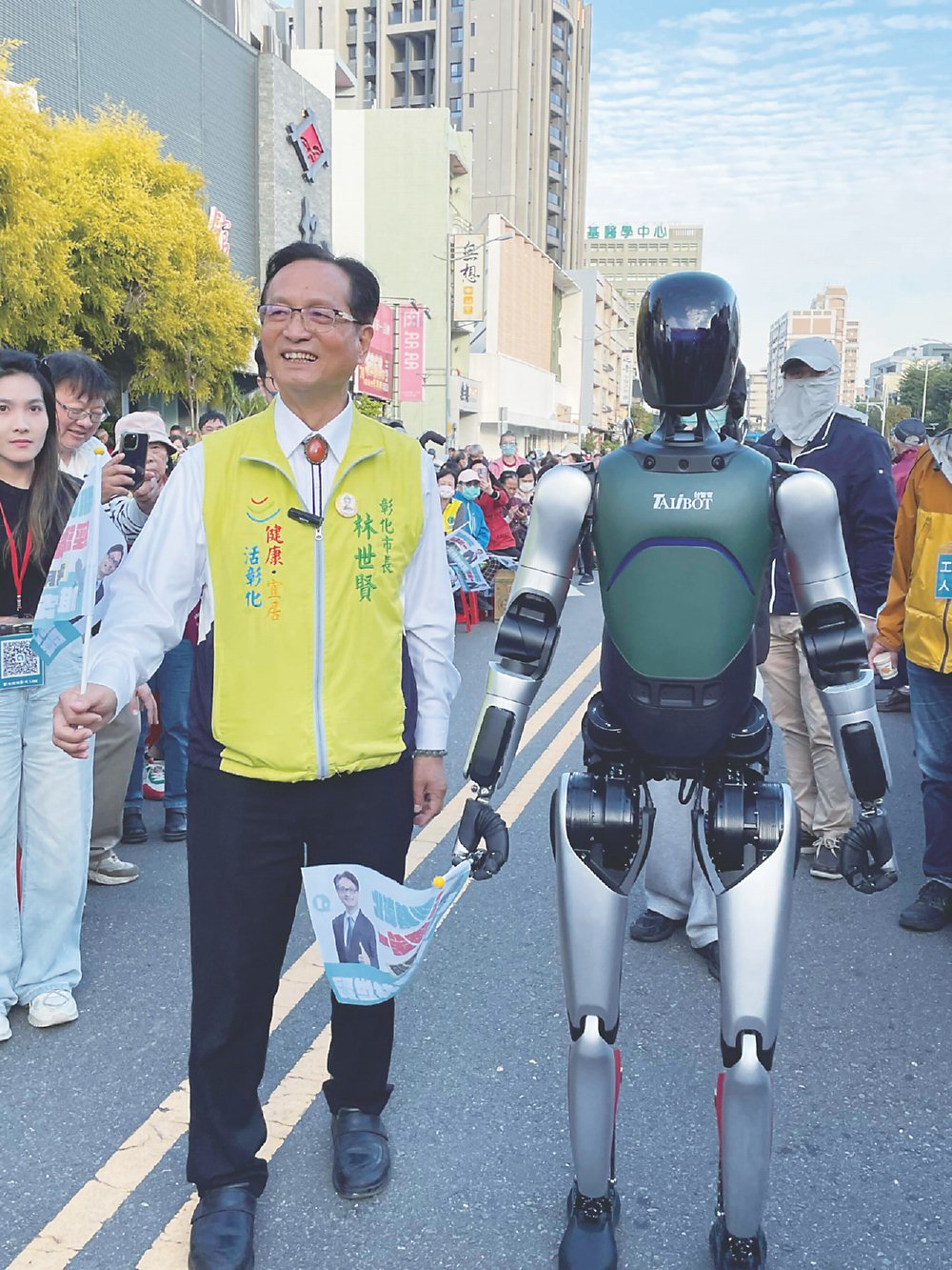 主打經濟與科技牌的彰化市長林世賢14日舉辦「彰化勝利團結大會」,現場出現台灣自主研發成功的人形機器人「台智寶」站台,成為一大亮點,林世賢強調,產業和經濟是翻轉彰化的重中之重,他將全力引進AI相關產業,並強化彰化的綠能、風電、再生能源等優勢,促進更好的產業經濟,這樣才能透過財政稅收,讓彰化縣民享有更好的福利政策。