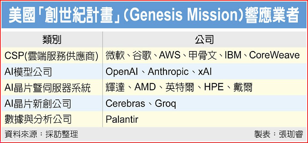 Genesis Mission目標在2030年前,使美國科學生產力翻倍。AI成為國家戰略核心,24家美國大廠如微軟、谷歌、AWS等雲端資料中心大廠,AI模型公司及新創AI晶片企業也紛紛投入。