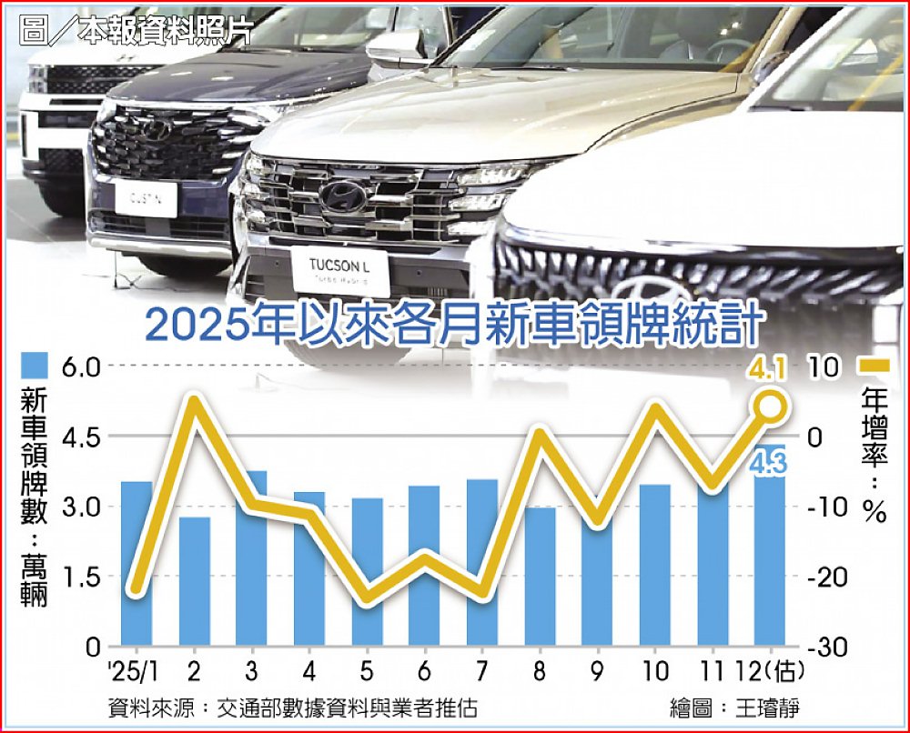 2025年車市拉尾盤!受惠於年底促銷旺季、消費者對雙稅(關稅、貨物稅)議題觀望心態逐漸淡化,12月買氣明顯回籠,前15日新車領牌數1.43萬輛、年增16.7%,車廠樂觀推估,12月領牌可望突破4.3萬輛、上看4.4萬輛,優於原先預期,將創今年單月新高,且助攻全年總市場站上41萬輛。