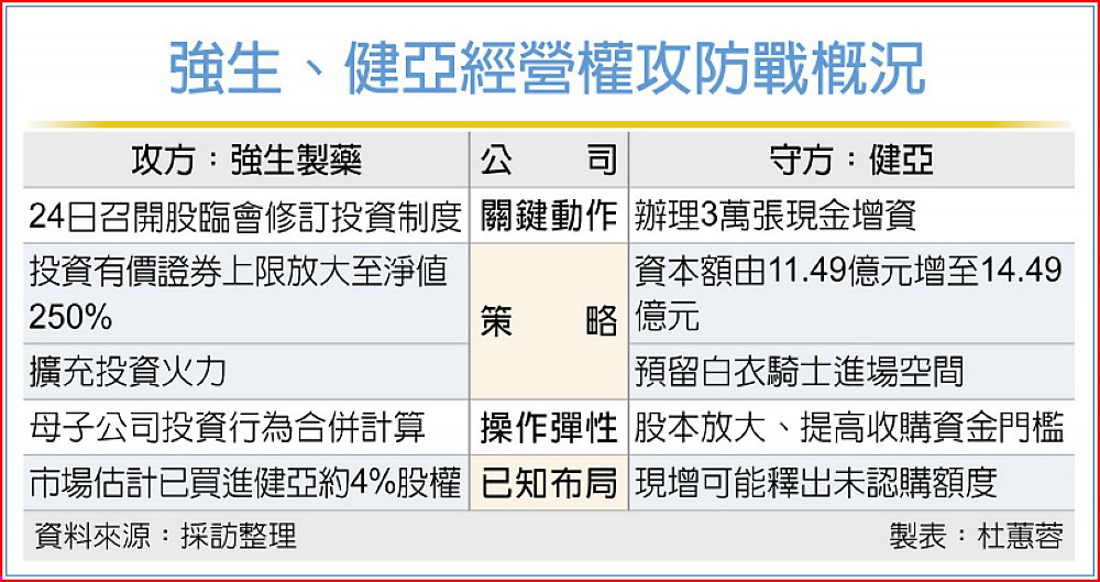 上櫃生醫股健亞好不容易擺脫同業健喬的併購,馬上又面臨新的挑戰,上櫃公司強生製藥24日將召開股東臨時會,擬大幅修訂集團投資制度,將有價證券投資上限一舉拉高至淨值250%,劍指健亞經營權。由於市場盛傳強生攜手上櫃電子公司耀勝,已於市場合計買進健亞約4%股權,強生製藥修法時點與方向被視為高度「對準目標」,也讓健亞經營權攻防戰提前升溫。
