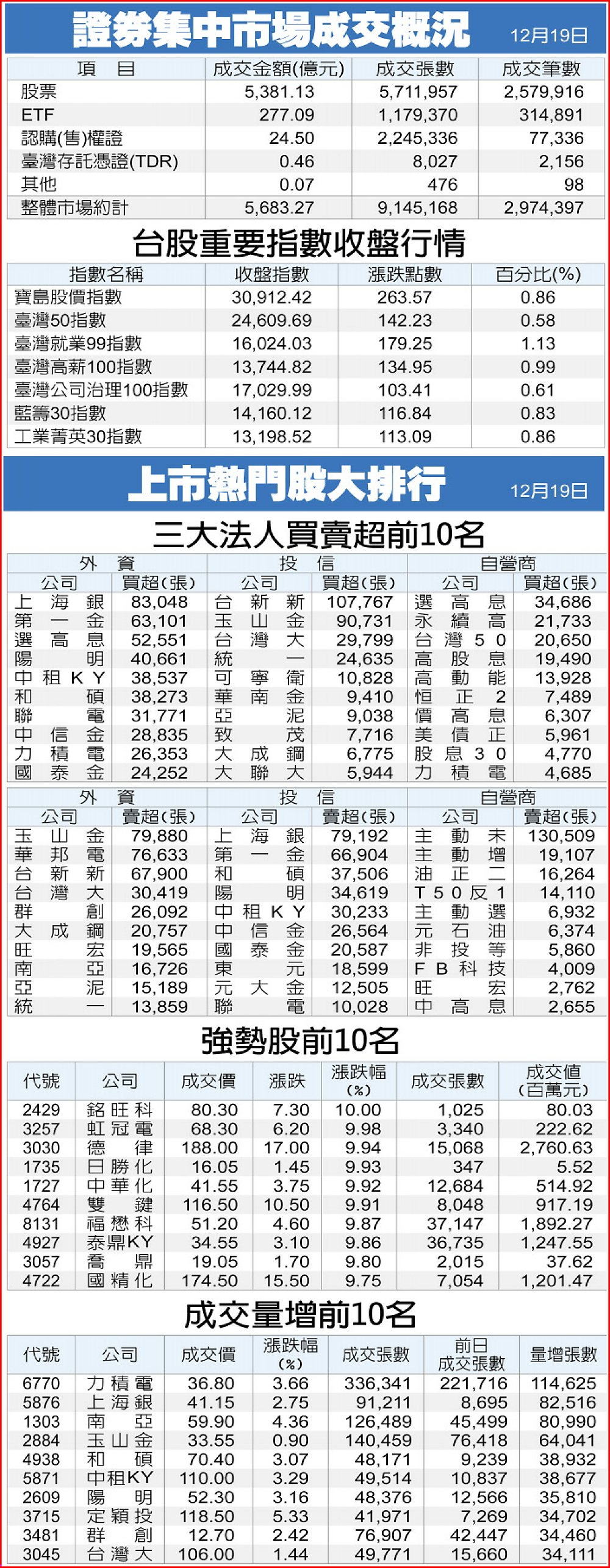 證券集中市場成交概況、上市熱門股大排行