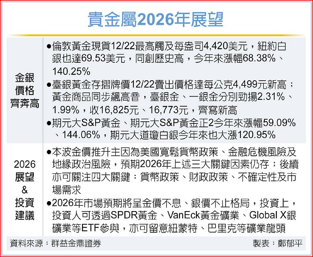 美國擴大封鎖委內瑞拉石油,並空襲敘利亞以回應美軍遇襲,地緣政治緊張情勢升溫,激勵金、銀、銅等金屬相繼創高。黃金22日首次升破每盎司4,400美元、白銀更逼近每盎司70美元,至於銅價也再登高峰,距每公噸12,000美元大關僅咫尺。