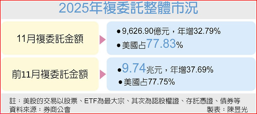 國際股市11月出現漲多回檔壓力,AI泡沫論疑雲未散,抑制多方買盤搶進,致11月證券商複委託交易金額雖跌落兆元大關至9,626.9億元,呈月減28.18%,終結連兩月破兆元紀錄,不過,仍創下今年以來單月第三高,年增亦高達32.79%。券商主管對此分析,觀察12月市場押寶美國聯準會降息,以及AI長線發展趨勢,預料12月複委託股債交易熱度可望回升,累計前11月複委託已達9.74兆元,年增37.69%,全年篤定突破10兆元歷史新高。