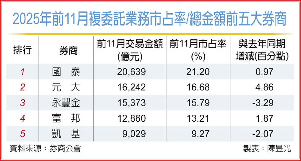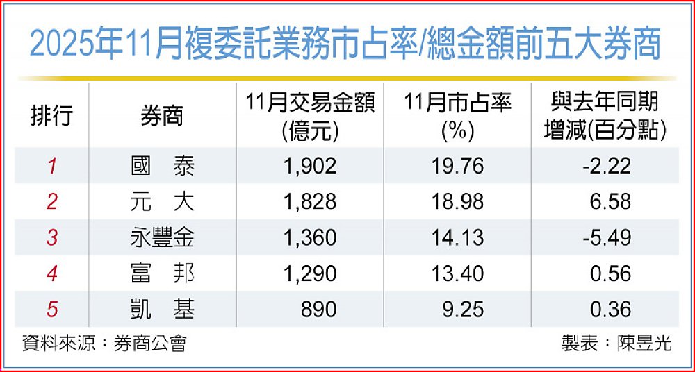 在11月複委託市占率表現上,數據顯示,國泰證雖年減2.22個百分點,但仍以市占19.76%穩居龍頭,元大證則顯著增加6.58個百分點到18.98%,位居市占第二名,永豐金證減少5.49個百分點至14.13%,與第四名富邦證13.4%相較,市占率縮小至1個百分點內;凱基證則以9.25%,年增0.36個百分點,在市占率排名第五。