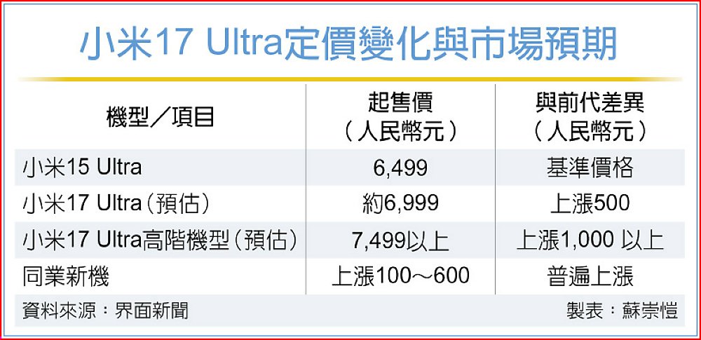 小米集團總裁盧偉冰近日證實,將於25日發表的旗艦新機小米17 Ultra確定漲價。市場人士預估,受全球記憶體價格飆漲影響,該機型起售價恐從人民幣(下同)6,499元上調至6,999元,部分高階機型漲幅甚至達1,000元以上。盧偉冰坦承定價壓力極大,且漲價幅度「會有點多」。