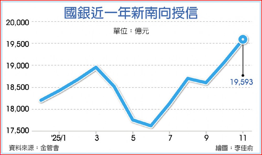 國銀新南向授信第四季加速衝向2兆元,金管會統計,截至11月底,國銀對新南向國家授信餘額1兆9,593億元,光10月、11月二個月就新增近千億元,前11個月增加1,389億元,較目標728億元的達標率191%。
