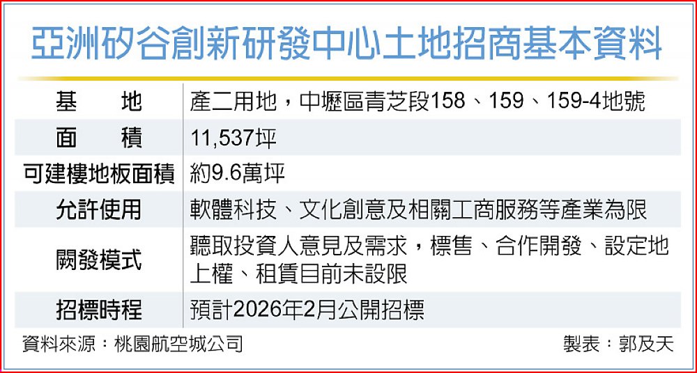 此次招商的範圍,包括原為亞矽創新研發中心1.1萬坪土地,以及包含對側原先做為觀光飯店規劃招商流標、合計的5,327坪的周邊土地,將進行整合開發。其中核心的產二用地可做為產業辦公室、企業總部等,預估樓地板面積約9.6萬坪。22日說明會吸引不少壽險業及開發商前往了解評估。