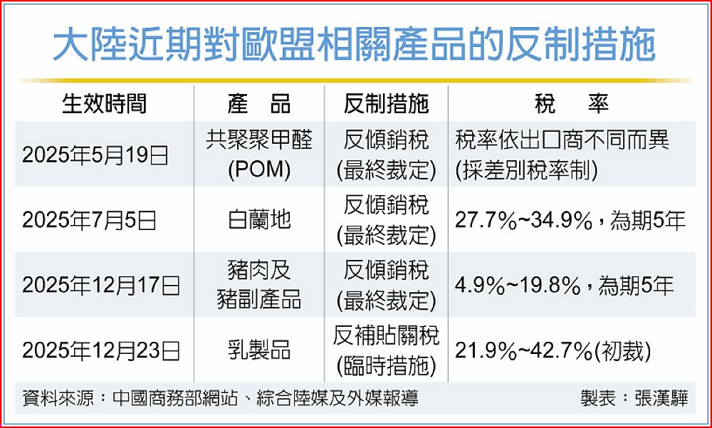 中國商務部22日宣布,對歐盟進口的「部分乳製品」加徵臨時關稅,稅率最高達42.7%,今(23)日正式生效。這是繼17日對歐盟的豬肉產品徵收新關稅後,中國再對歐盟產品祭出制裁,顯示中歐貿易戰持續拉長戰線,由電動車擴及到食品等領域。