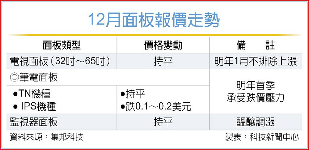 范博毓表示,進入12月,筆電面板需求受到記憶體缺貨與價格大幅上漲的衝擊正逐漸顯現,部分品牌希望可以趕在明年正式調漲整機出廠價格前,增加對中低階機種出貨,因此也帶動筆電面板短期需求的增溫。因明年的需求受到記憶體影響下不確定性更高,因此就算目前部分面板需求增加,面板廠對面板價格的態度卻更加放軟,希望以維持客戶關係為優先考量。在此前提下,預估12月份的筆電面板價格除了TN機種價格持平外,其餘IPS機種皆下跌0.1~0.2美元不等。而且第一季需求更加疲弱,不排除筆電面板價格仍將承受調整壓力。