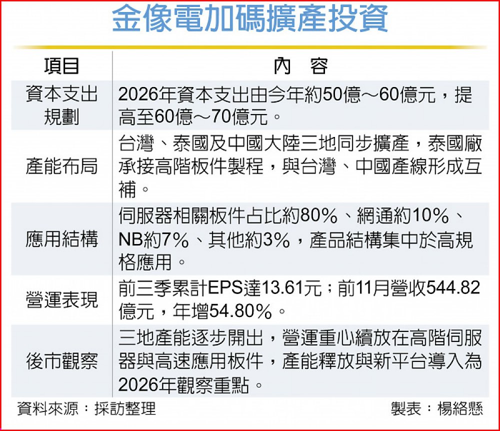 金像電(2368)22日代泰國子公司公告取得廠務工程,交易金額約新台幣10.6億元,持續推進海外布局;金像電亦同步推動台灣、泰國及中國三地擴充新產能,2026年資本支出由今年約50億~60億元,提升至60億~70億元區間,在既有接單基礎下,產能規劃已提前向中長期需求靠攏。