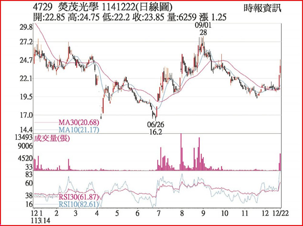 軍工題材點火,熒茂(4729)主力買盤帶動,股價連日走高,22日大漲5.53%作收,收盤價23.85元,拉出一根長紅K棒,成交量放大到6,236張。