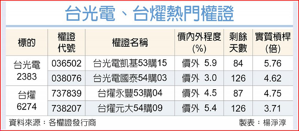 權證選擇上,若投資人持有現股已達獲利目標價位,但仍看好後市表現,可考慮部分獲利了結,並將部分資金轉入連結標的的權證,持續掌握潛在上漲空間。 材料升級概念股的相關權證中,包括台光電凱基53購15、台光電國泰54購03、台燿永豐53購04、台燿元大54購09等,價外程度皆僅在6%之內,而槓桿倍數高達5.76~3.71倍。