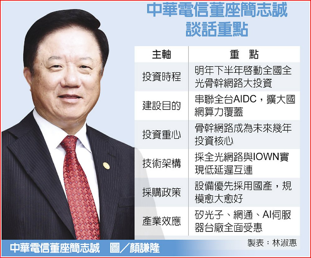 總統賴清德宣布,南科國網雲端算力中心確定由中華電、NTT合作興建後, 中華電信董事長簡志誠23日進一步指出,中華電信決定在全國展開全光網路的骨幹網路(backbone)大投資,同時導入全光化網路,串連全台各地的AIDC中心,讓國網的覆蓋可以藉此擴大,投資商用網路的時間點,落在明年下半年。