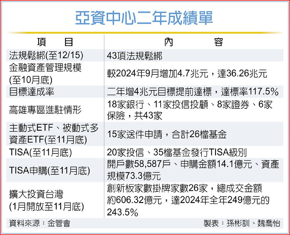 金管會主委彭金隆23日指出,亞資中心「2年有感、4年有變、6年有成」的二年目標已提前完成,截至12月15日已完成43項法規鬆綁,銀行、保險、證券等三業金融資產管理規模截至今年10月底已較去年9月政策推出時增加4.7兆元、達36.26兆元,二年要拚增加4兆元目標提前達標,達標率117.5%,六年增至60兆元也正加速進行。