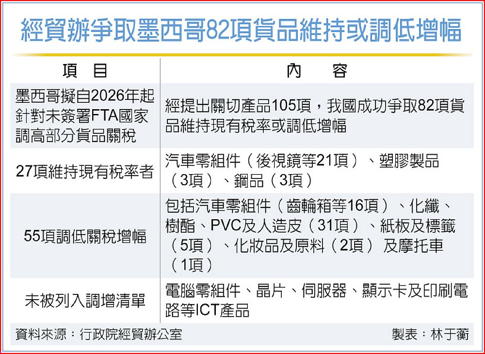 此外,經貿辦指出,我國業者關切的電腦零組件、晶片、伺服器、顯示卡及印刷電路等ICT產品,其占對墨總出口之70%,均未被列入調增清單,對我出口影響有限。