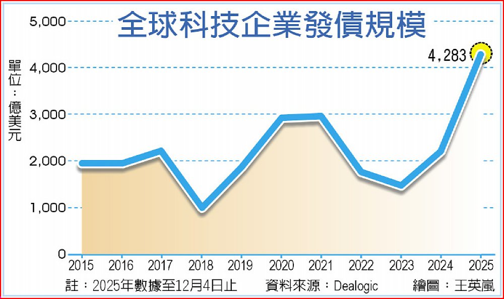 根據Dealogic數據顯示,今年截至12月首周,全球科技業共發行4,283億美元債券,其中美國企業約占8成,達3,418億美元,而歐洲和亞洲科技企業分別為491億美元和330億美元。