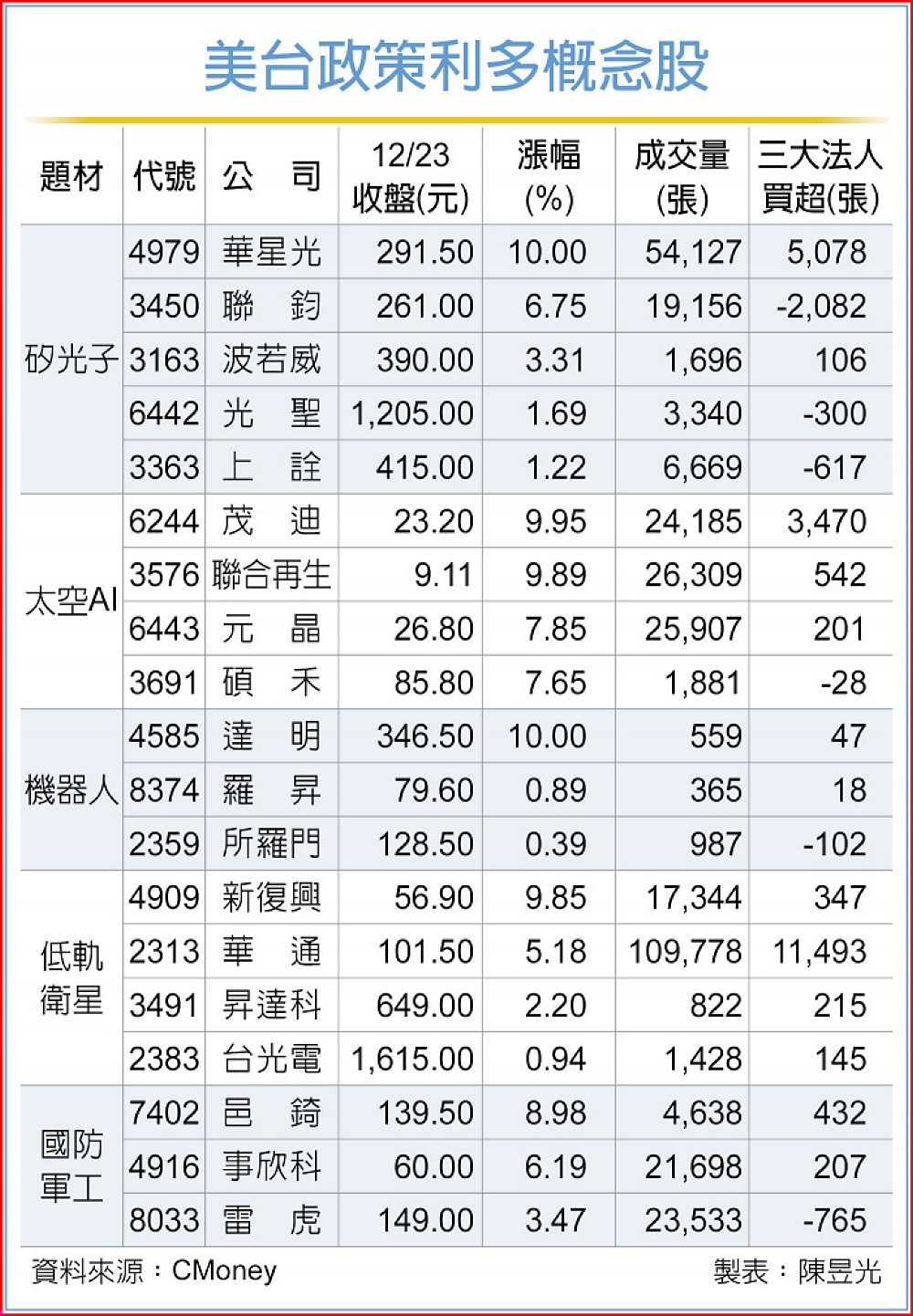 時序進入年底,展望2026年,包括美國期中選舉、台灣九合一選舉陸續登場,市場聚焦政策利多將出籠,如美總統川普喊出強化機器人發展、簽署太空優勢令等,台灣也主打AI新十大建設,擴大國防能量等,帶旺概念股表現。