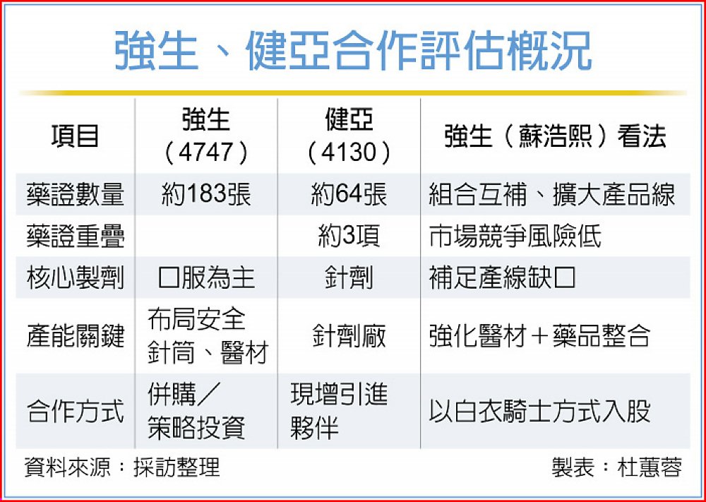 蘇浩熙表示,健亞目前持有64張藥證,強生累計藥證數量達183張,經內部盤點後,雙方實際重疊的藥品僅約3項,且其中1項並未量產,顯示彼此在市場上直接競爭風險極低,反而具備擴充產品組合、提升市場覆蓋率的合作空間。