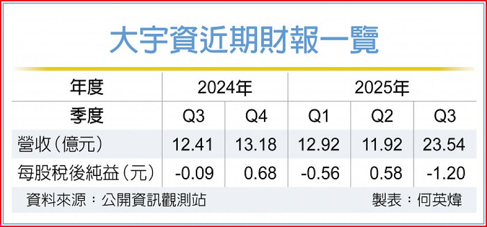 大宇資2025年累計前11月營收66.05億元,年增44.47%。今年度因投資台灣光罩及揚智科技,自9月開始合併財報,目前半導體相關業務的營收占比大約65%,而合正等重電相關的業務,約占22%~25%。
