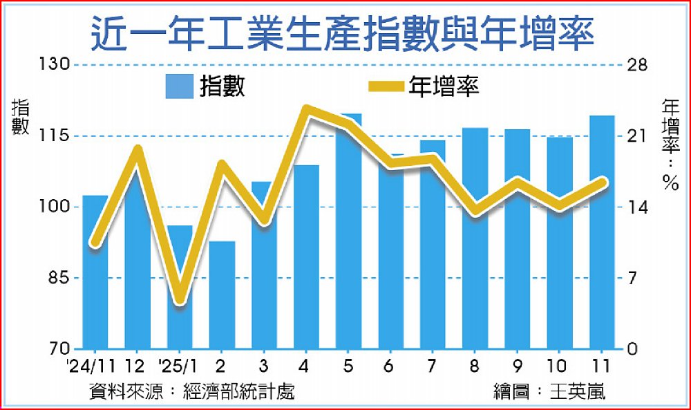 統計處表示,11月製造業生產指數120.84,年增17.35%,主因人工智慧、高效能運算及雲端資料服務等需求續強,支撐資訊電子產業生產動能穩健成長,不過,部分傳統產業因市場競爭及需求動能不佳而續呈減產,抵銷部分增幅;累計1至11月較上年同期增加17.38%。